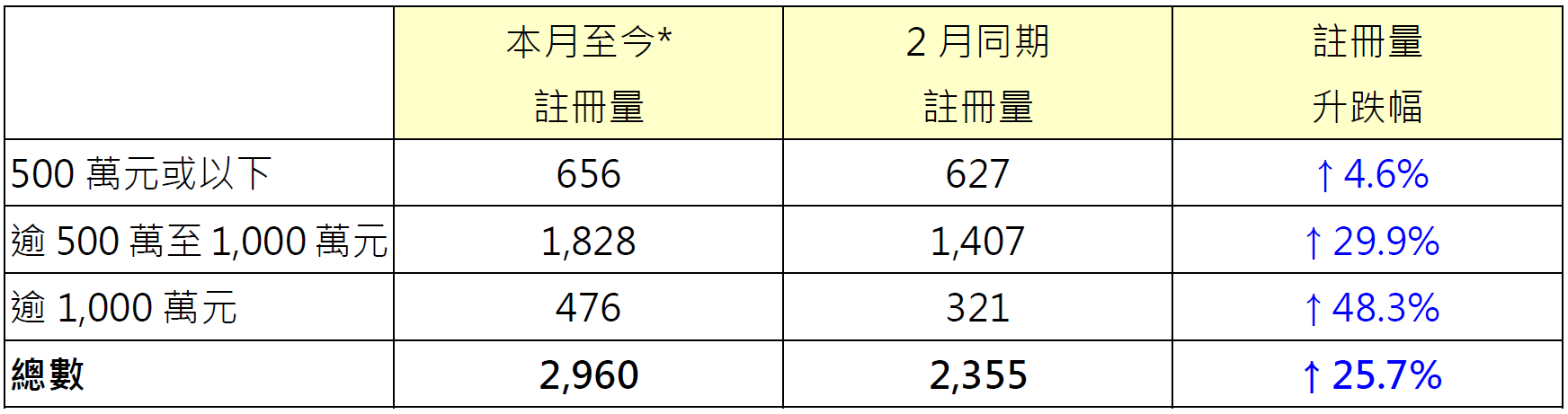 若以金額劃分本月至今二手住宅註冊量表現,其中價值500萬元或以下二手住宅物業錄656宗註冊,較2月同期的627宗增加約4.6%;價值500萬以上至1,000萬元二手住宅物業錄1,828宗註冊,較2月同期的1,407宗增加約29.9%;價值1,000萬元以上二手住宅物業錄476宗註冊,較2月同期的321宗增加約48.3%(見表)。