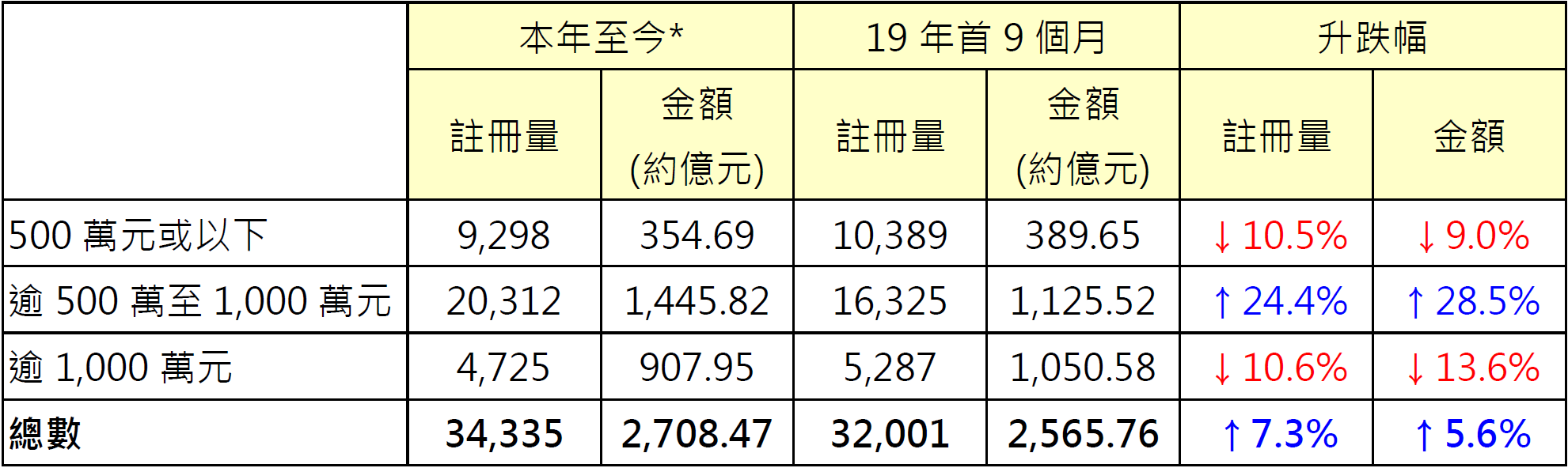 表:按金額劃分本年至今*二手住宅註冊與19年首9個月數字比較