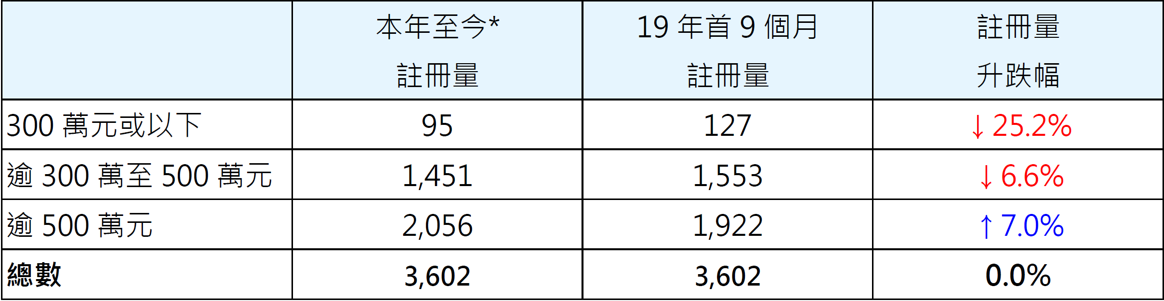 表一: 按金額劃分本年至今*二手居屋註冊量與19年首9個月比較