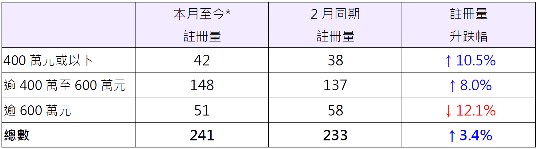 按金額劃分二手公屋及居屋註冊量按月同期表現,其中400萬元或以下二手公屋及居屋錄42宗註冊,較2月同期的38宗增加約10.5%;逾400萬至600萬元二手公屋及居屋錄148宗註冊,較2月同期的137宗增加約8%;逾600萬元二手公屋及居屋錄51宗註冊,較2月同期的58宗則減少約12.1%(見表)。