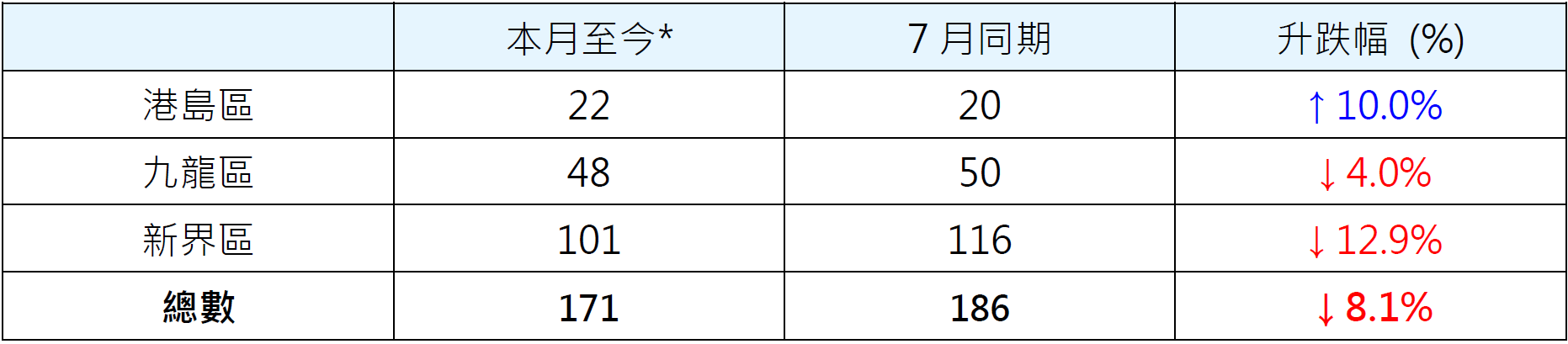 表一: 按三區劃分本月至今*二手居屋註冊量與7月同期比較