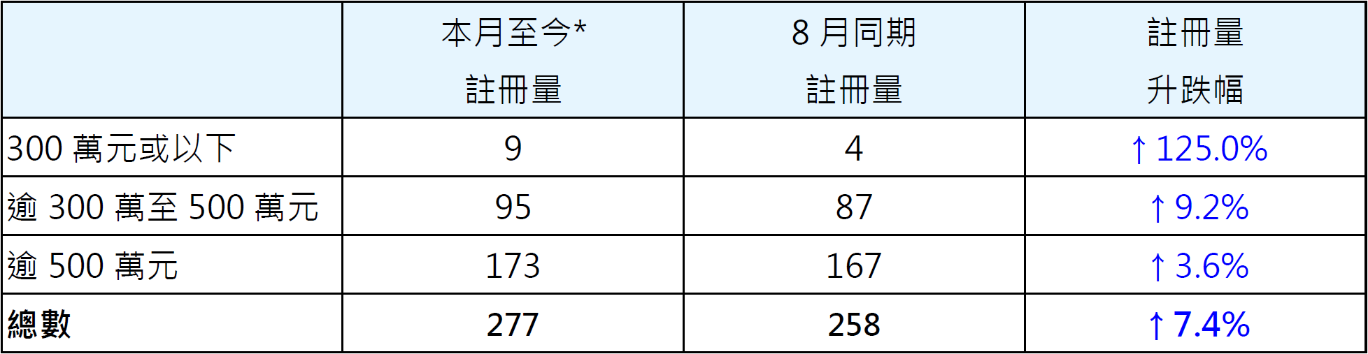 表一: 按金額劃分本月至今*二手居屋註冊量與8月同期比較