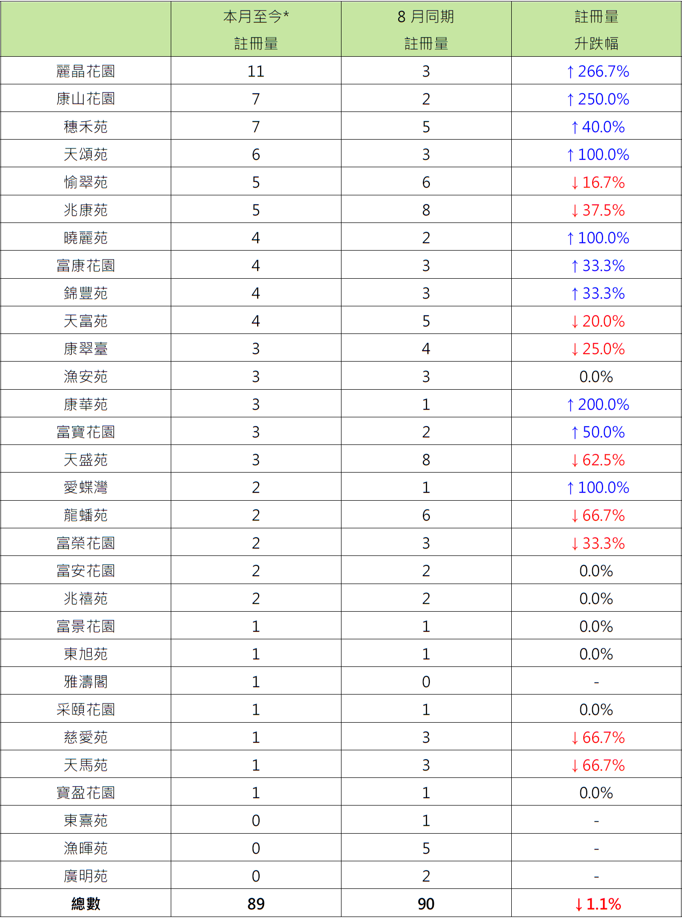 報升屋苑中,九龍灣麗晶花園錄11宗註冊,較8月同期的3宗增加逾2.6倍;鰂魚涌康山花園錄7宗註冊,較8月同期的2宗增加2.5倍;藍田康華苑錄3宗註冊,較8月同期的1宗增加2倍。