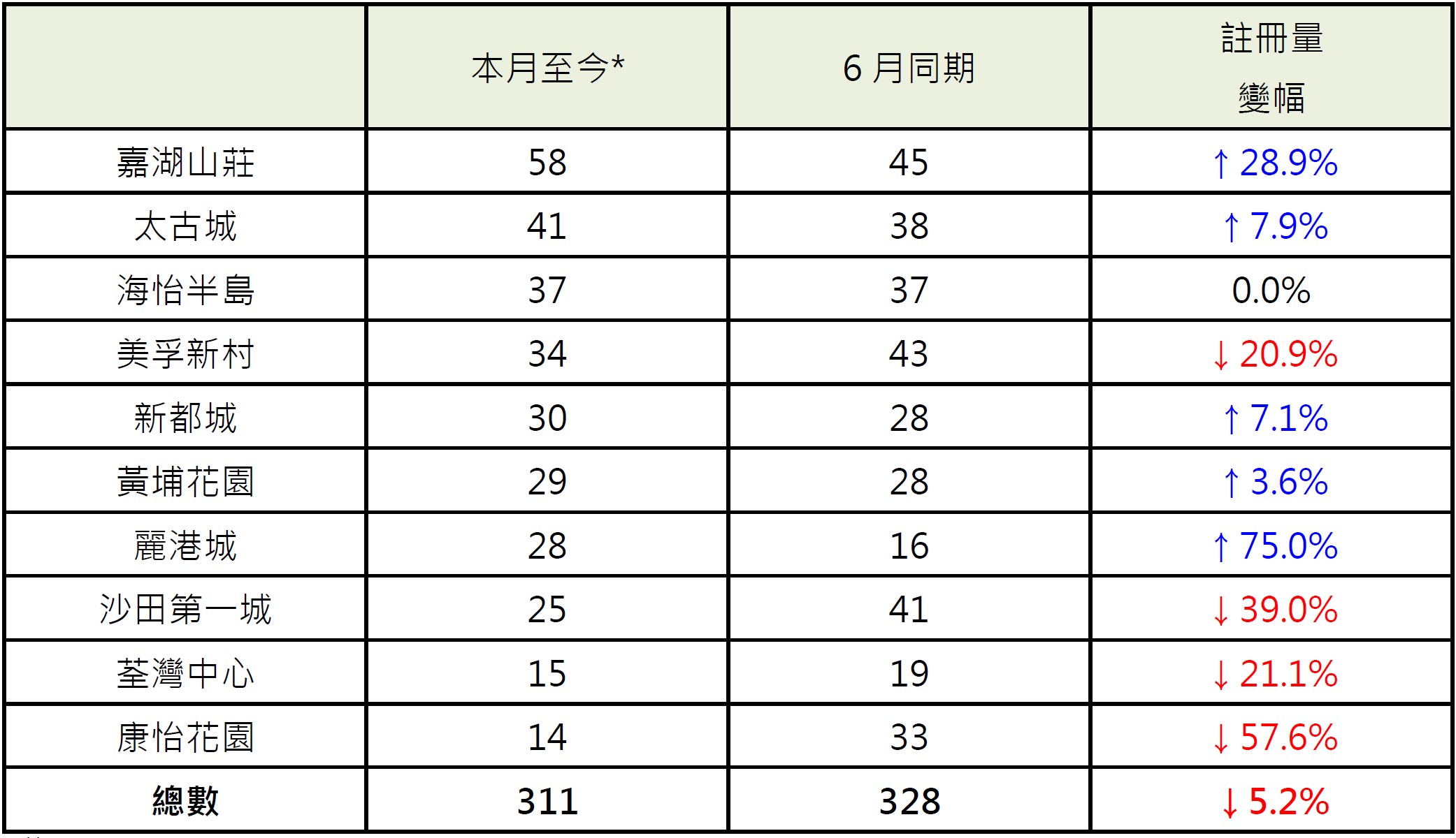 十大傳統屋苑本月至今與6月同期相比,有4個屋苑報跌,5個屋苑報升,1個屋苑持平;報跌屋苑中,康怡花園錄14宗註冊,較6月同期的33宗減少約57.6%;沙田第一城錄25宗註冊,較6月同期的41宗減少約39.0%;報升屋苑中,麗港城錄28宗註冊,較6月同期的16宗增加75%;新都城錄30宗註冊,較6月同期的28宗增加約7.1%。