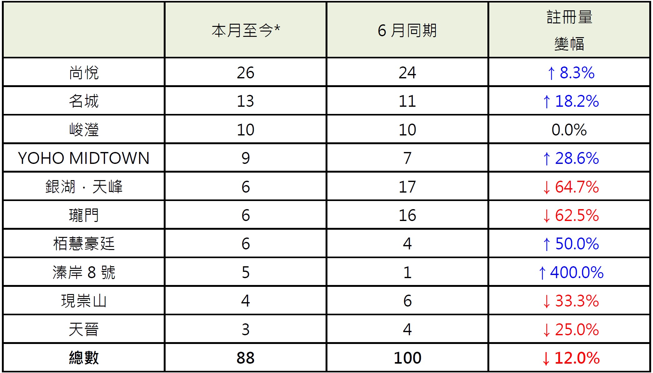 而本行選取的十個新晉屋苑本月至今錄88宗註冊,較6月同期的100宗減少12%,跌幅較十大傳統屋苑顯著;當中有4個屋苑報跌,5個屋苑報升,1個屋苑持平;報跌屋苑中,銀湖.天峰及瓏門各錄得6宗註冊,按月同期分別減少約64.7%及62.5%;報升屋苑中,溱岸8號錄5宗註冊,按月同期增加4倍;栢慧豪廷錄6宗註冊,按月同期增加50%。
