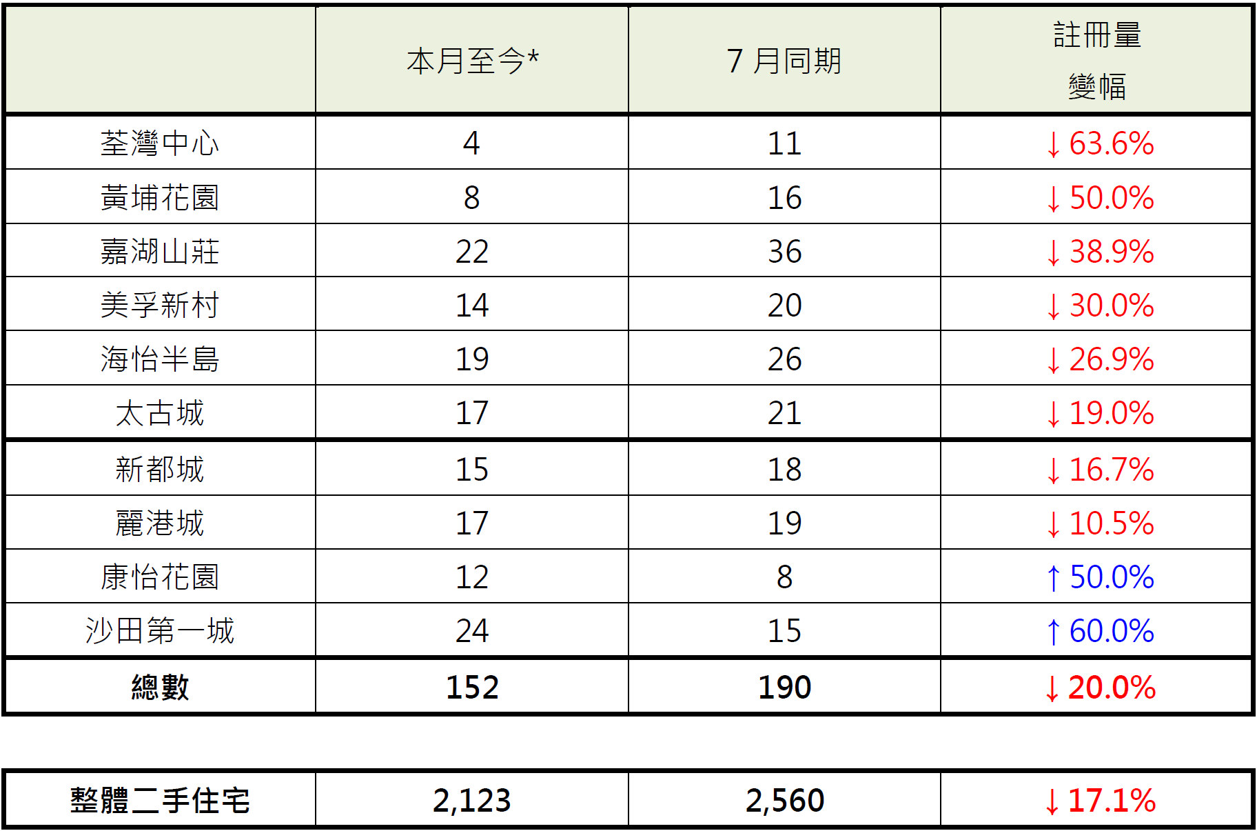 據土地註冊處資料顯示,整體二手住宅本月至今 (截至8月18日) 錄2,123宗註冊,較7月同期的2,560宗減少約17.1%;而十大傳統屋苑本月至今共錄得152宗註冊,較7月同期的190宗減少20%,暫跑輸大市。鑑於簽署買賣合約至遞交到土地註冊處註冊登記需時,8月註冊個案一般主要反映7月市況。