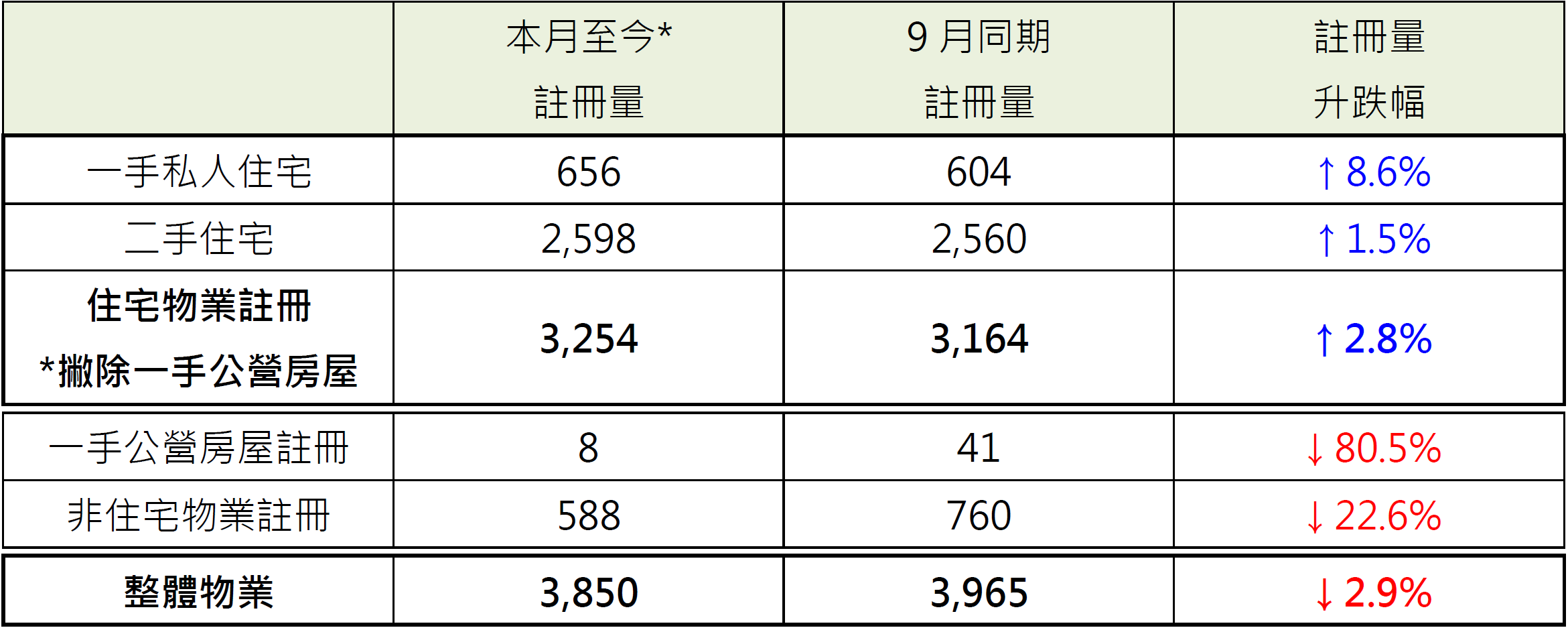 表: 本月至今*各類物業註冊與9月同期數字比較