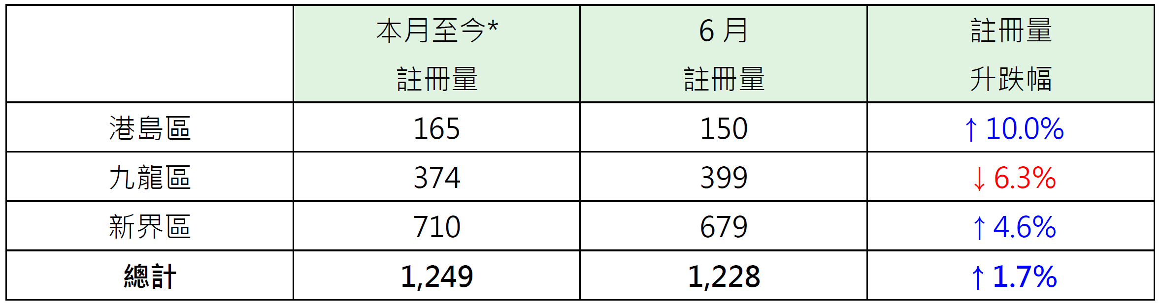表:本月至今*三區500萬元或以下二手住宅註冊量與6月數字比較