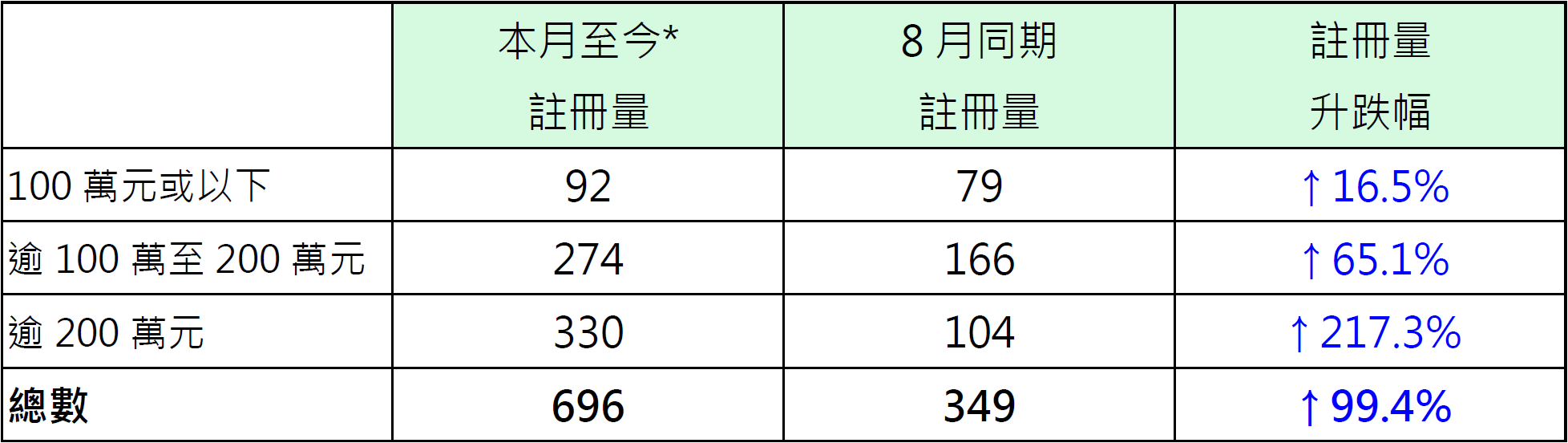 表: 本月至今*純車位註冊量與8月同期比較