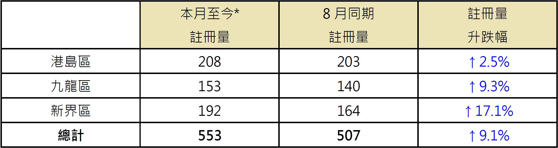 表:本月至今*三區之逾千萬元二手住宅註冊量與8月同期比較