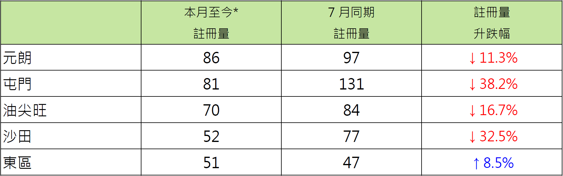 若以18區劃分500萬元或以下二手住宅註冊量,當中有6區按月同期表現優於大市,其中黃大仙區本月至今錄39宗註冊,較7月同期的31宗增加約25.8%;東區本月至今錄51宗註冊,較7月同期的47宗增加約8.5%;北區本月至今錄37宗註冊,較7月同期的36宗增加約2.8%。