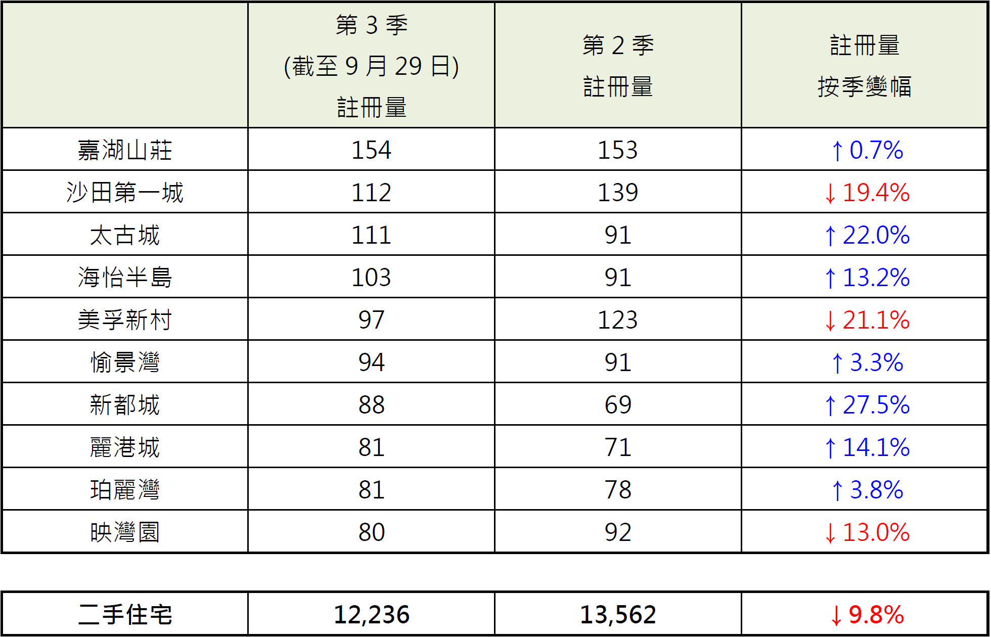 而嘉湖山莊以154宗註冊成為最多二手住宅註冊量的屋苑,較第2季的153宗微增不足1%;沙田第一城以112宗註冊排第二,較第2季的139宗減少約19.4%;太古城以111宗註冊緊隨其後,較第2季的91宗增加約22.0%;海怡半島以103宗註冊排第四,較第2季的91宗增加約13.2%;而美孚新村以97宗註冊排第五,較第2季的123宗減少約21.1% (見表)。