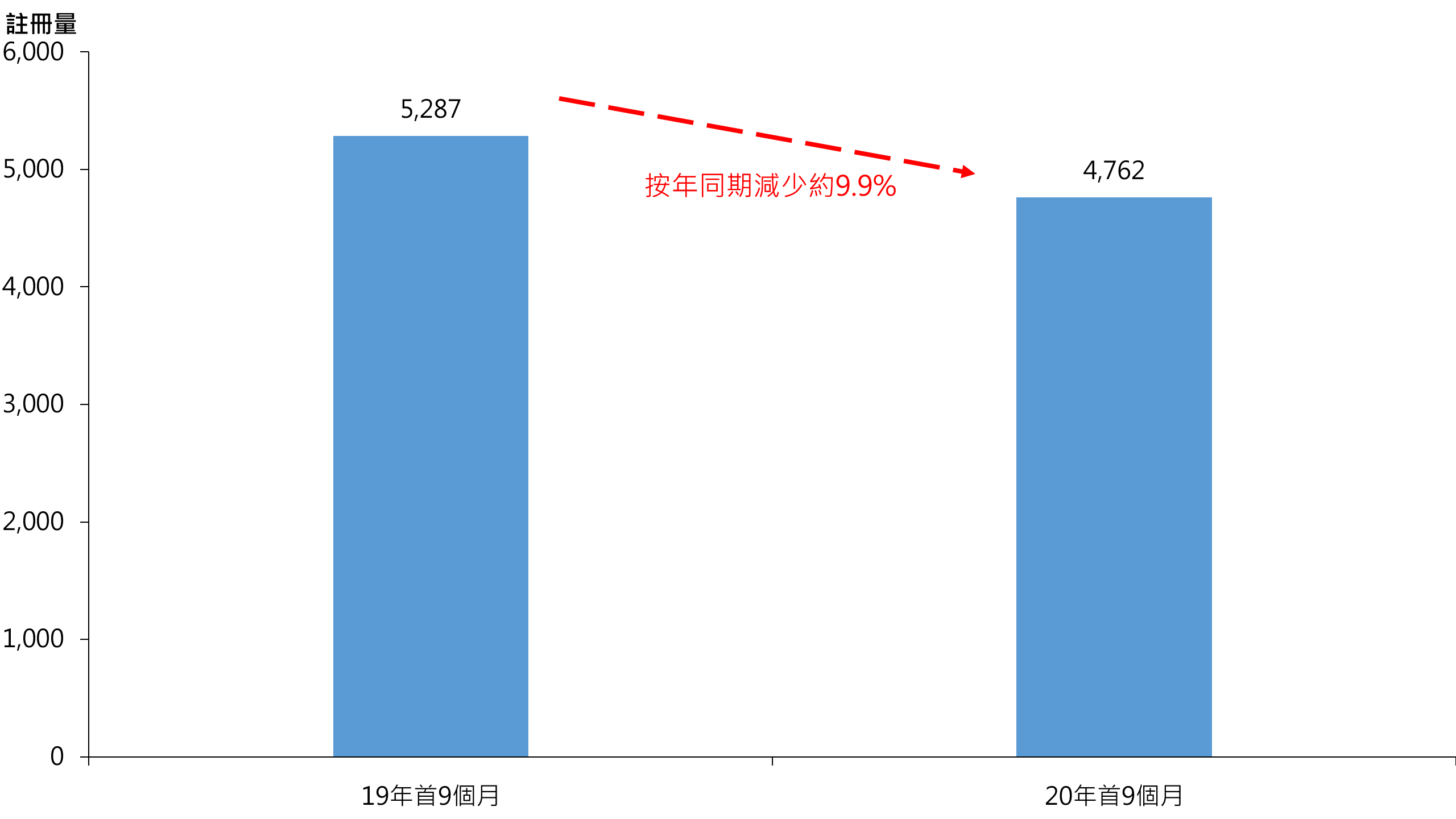 雖然逾千萬元二手住宅註冊量按季持平,但若以今年首9個月計算,則合共錄4,762宗註冊,較去年首9個月的5,287宗減少約9.9% (見圖)。