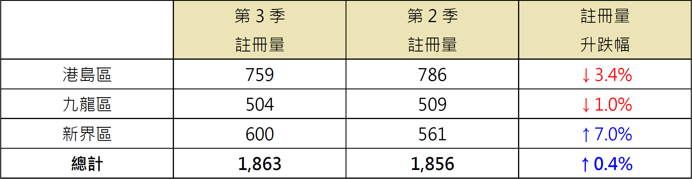 按港島、九龍及新界三區劃分第3季逾千萬元二手住宅註冊量表現,其中新界區錄600宗註冊,較第2季的561宗增加約7.0%;反觀,九龍區錄504宗註冊,較第2季的509宗減少約1.0%;港島區錄759宗註冊,較第2季的786宗減少約3.4% (見表)。