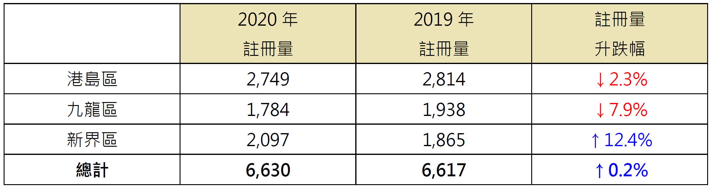 若以港島、九龍及新界三區劃分去年逾千萬元二手住宅註冊量表現,其中港島區錄2,749宗註冊,較19年的2,814宗減少約2.3%;九龍區錄1,784宗註冊,較19年的1,938宗減少約7.9%;而新界區錄2,097宗註冊,較19年的1,865宗增加約12.4%(見表)。
