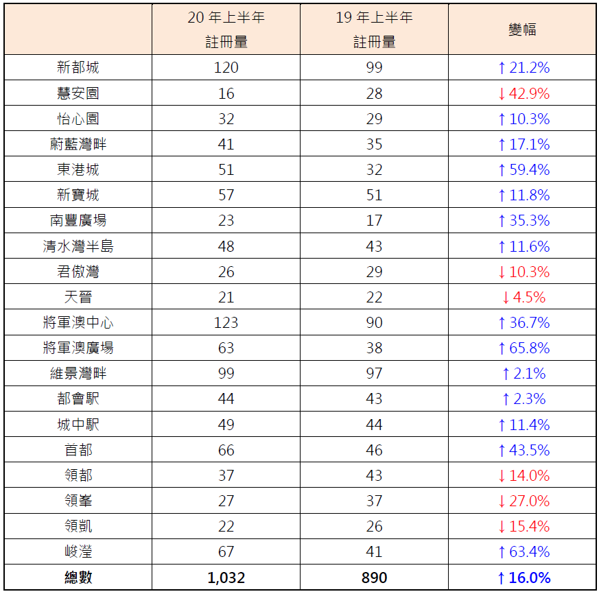 表: 20年上半年將軍澳區20個私人屋苑註冊量與19年上半年比較