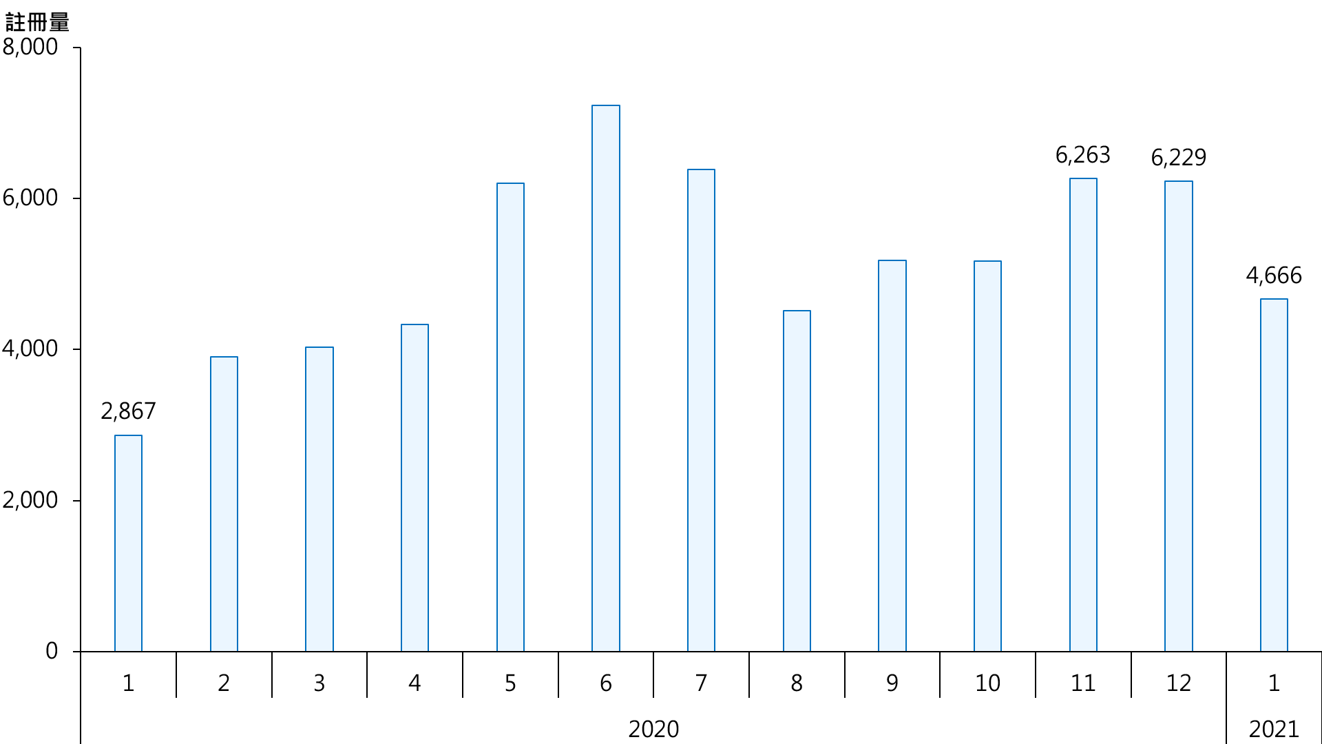 據土地註冊處最新資料顯示,2021年1月錄4,666宗住宅物業註冊(撇除一手公營房屋),較2020年12月的6,229宗減少約25.1%,連跌2個月,惟與2020年1月的2,867宗相比則增加約62.7%(見圖)。因簽署買賣合約至遞交到土地註冊處註冊登記需時,今年1月註冊個案一般主要反映去年12月市況,而近期一二手交投暢旺的情況,料將於2月註冊量反映出來。