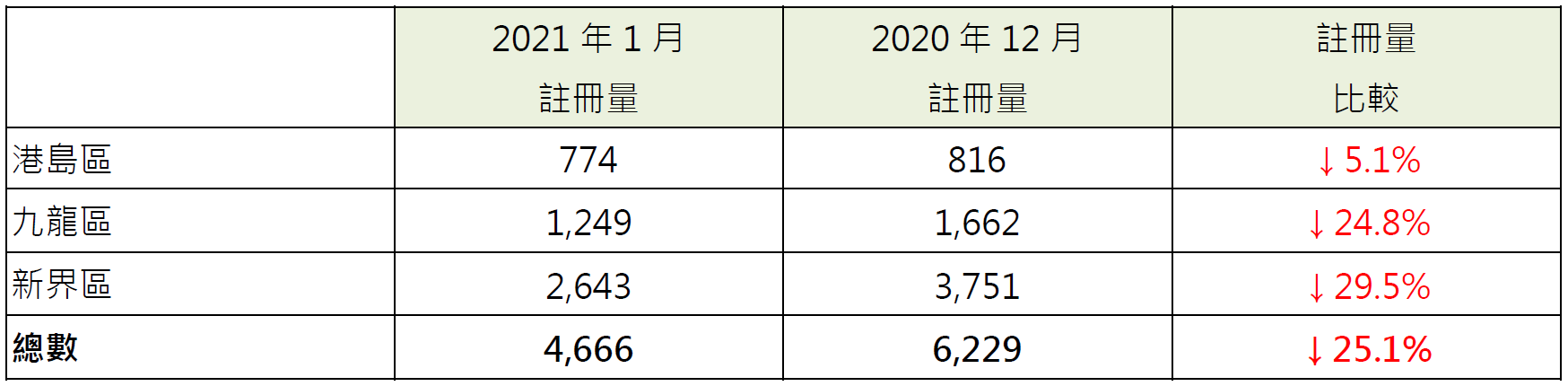 表:2021年1月各區整體住宅物業註冊量與2020年12月數字比較