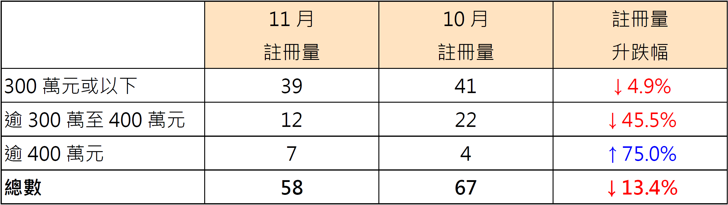 按金額劃分11月二手公屋註冊量表現,其中價值300萬元或以下二手公屋錄39宗註冊,較10月的41宗減少約4.9%;價值逾300萬至400萬元二手公屋錄12宗註冊,較10月的22宗減少約45.5%;而價值逾400萬元二手公屋錄7宗註冊,較10月的4宗則增加75% (見表)。