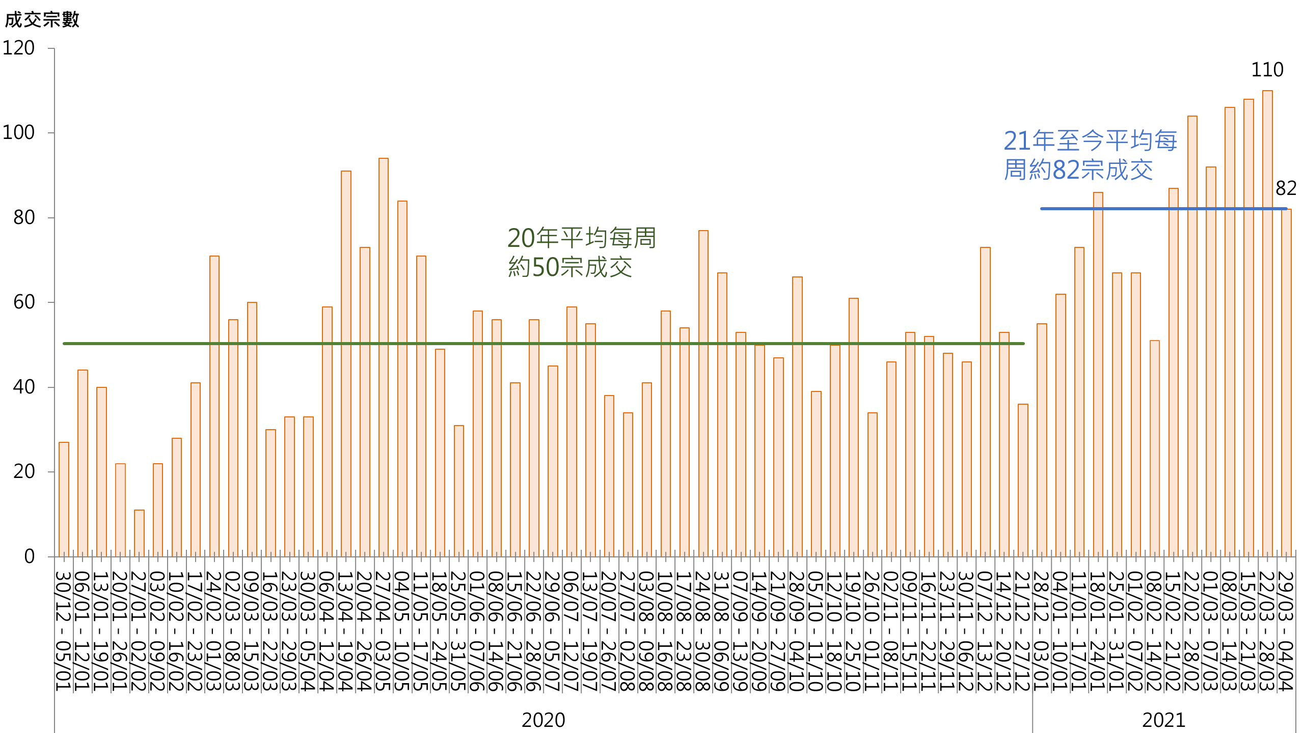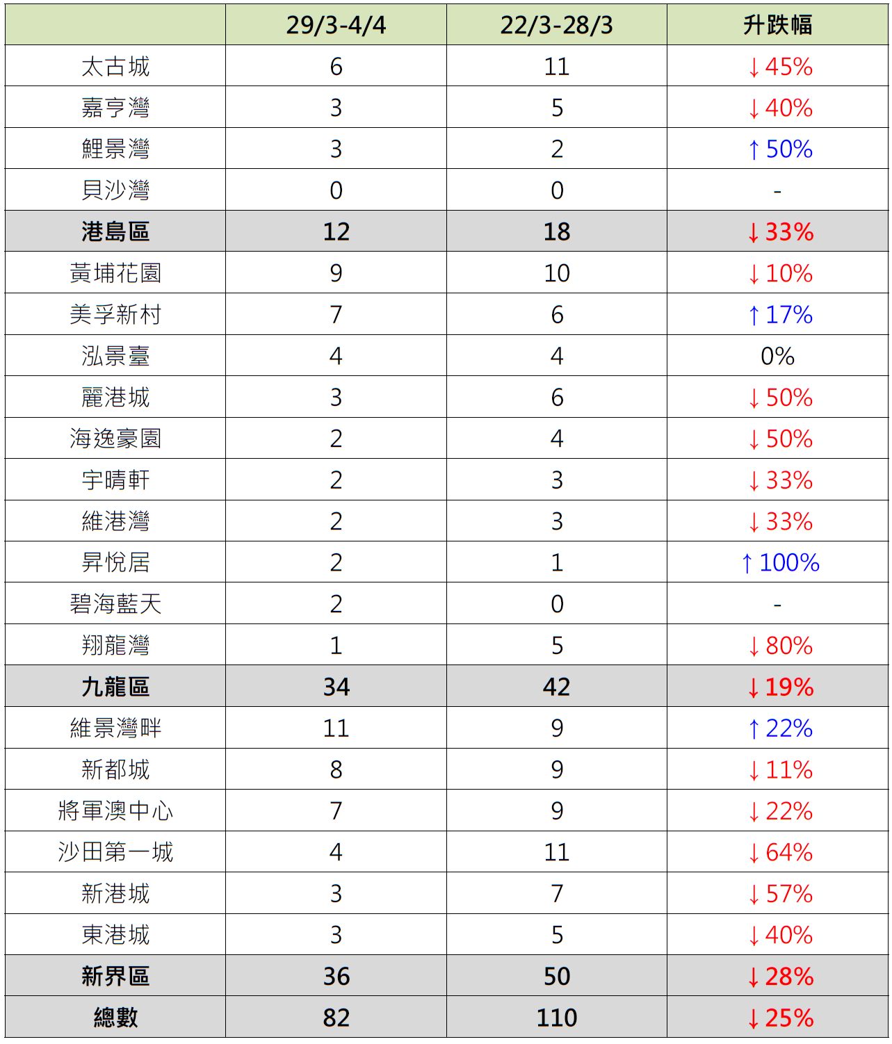 據本行前線分行所錄得的數字顯示,綜合過去一星期(3月29日至4月4日)全港20大主要屋苑二手買賣錄82宗成交,雖較前周(3月22日至3月28日)的110宗減少約25%,但仍與本年至今平均每周的成交宗數相若,更較去年平均每周約50宗高逾6成(見圖)。