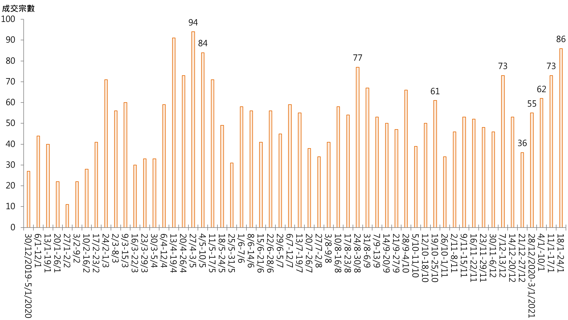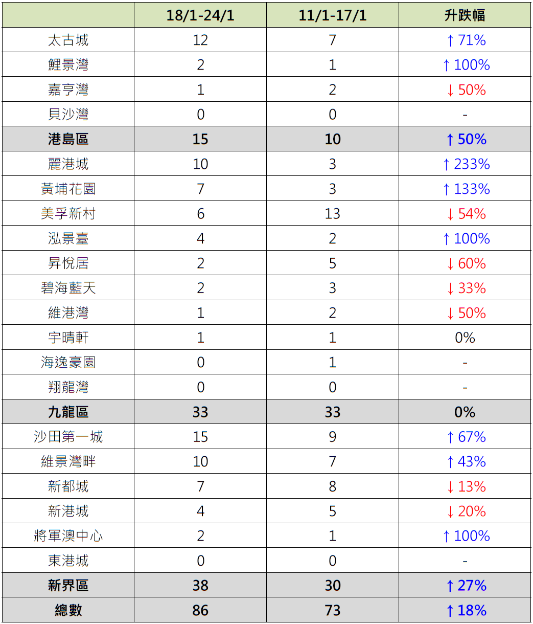 據本行前線分行所錄得的數字顯示,綜合過去一星期(1月18日至1月24日)全港20大主要屋苑二手買賣錄86宗成交,較前周(1月11日至1月17日)的73宗增加約18%,連升4周,兼創近38周新高(見圖)。