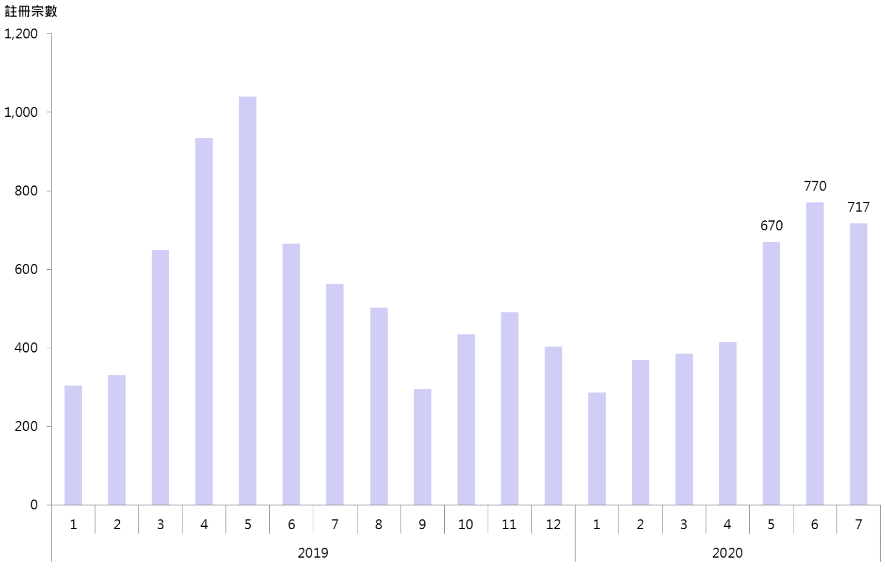 據土地註冊處資料顯示,7月錄717宗逾千萬元二手住宅註冊,雖較6月的770宗減少約6.9%,但已連續兩月企穩逾700宗水平 (見圖)。鑑於簽署買賣合約至遞交到土地註冊處註冊登記需時,7月註冊個案一般主要反映6月市況;數字未反映最近第三波疫情對逾千萬元二手住宅市場影響。