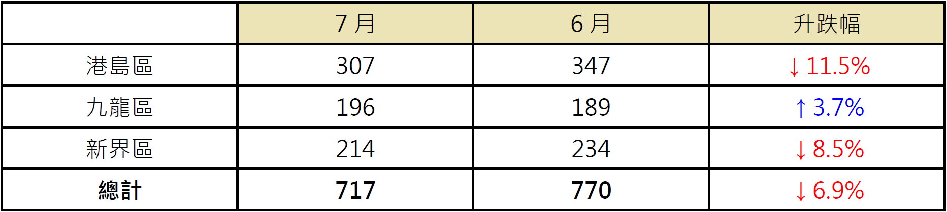 表:7月三區之逾千萬元二手住宅註冊量與6月比較