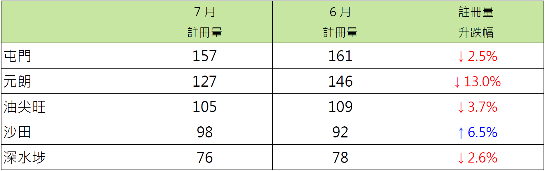 若以18區劃分500萬元或以下二手住宅註冊量,當中屯門區最多,錄157宗註冊,較6月的161宗減少約2.5%;元朗區以127宗註冊居次席,較6月的146宗減少約13.0%;油尖旺區以105宗註冊排第三,較6月的109宗減少約3.7%;沙田區以98宗註冊排第四,較6月的92宗增加約6.5%;深水埗以76宗註冊排第五,較6月的78宗減少約2.6% (見表)。