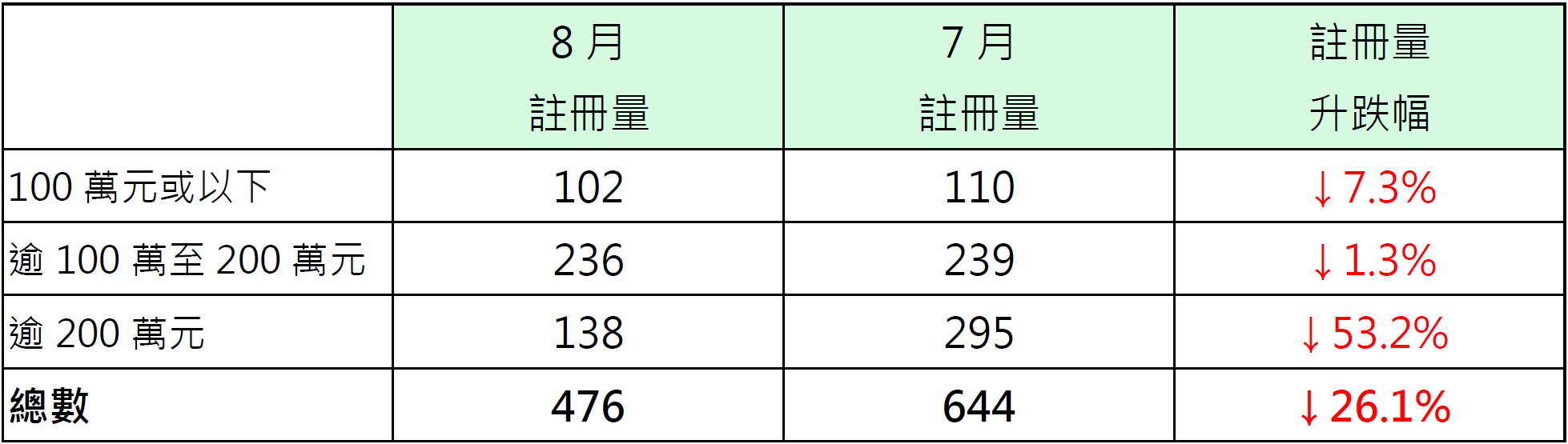 按金額劃分8月純車位註冊量表現,其中價值200萬元以上純車位錄138宗註冊,較7月的295宗減少約53.2%;價值100萬元或以下純車位錄102宗註冊,較7月的110宗減少約7.3%;價值100萬以上至200萬元純車位錄236宗註冊,較7月的239宗減少約1.3% (見表)。