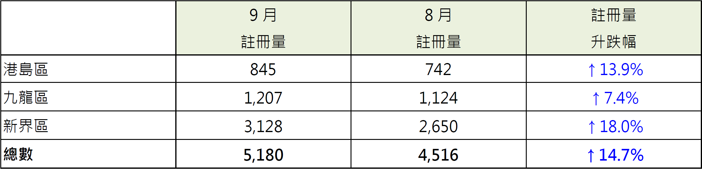 觀乎9月港島、九龍及新界各區住宅註冊量表現,當中新界區錄3,128宗註冊,較8月的2,650宗增加約18.0%;港島區錄845宗註冊,較8月的742宗增加約13.9%;九龍區錄1,207宗註冊,較8月的1,124宗增加約7.4% (見表)。